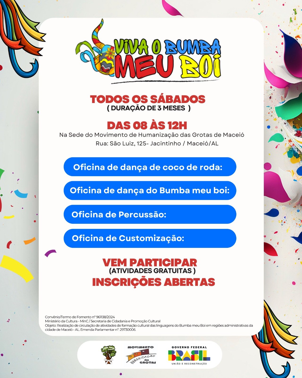 Objeto: Circulação de atividades formativas culturais das linguagens do Bumba Meu Boi nas regiões administrativas de Maceió/AL